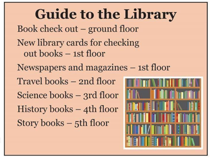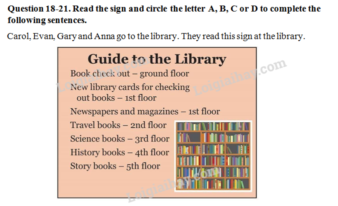 Carol, Evan, gary và Anna cùng đến thư viện. Họ đọc bảng hướng dẫn này tại thư viện.
