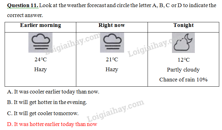Question 11. Look at the weather forecast and circle the letter A, B, C or D to indicate the correct answer.