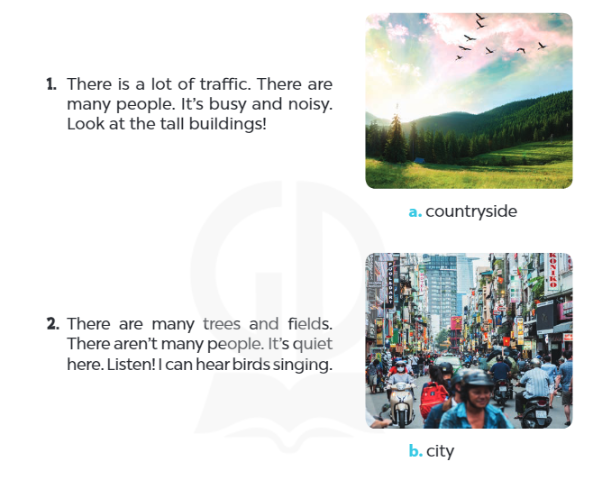 (Có nhiều cây cối và cánh đồng. Không có nhiều người lắm. Ở đây yên tĩnh. Nghe kìa! Tôi có thể nghe thấy tiếng chim hót.)
