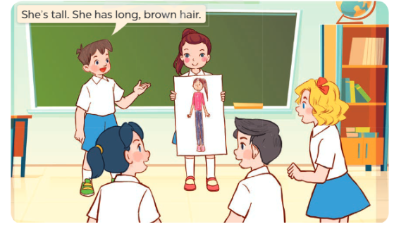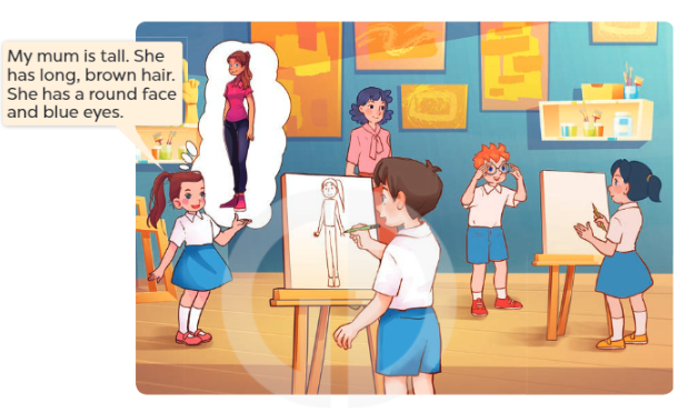 (Mẹ tôi cao. Cô ấy có mái tóc dài, màu nâu. Cô ấy có khuôn mặt tròn và đôi mắt xanh.)