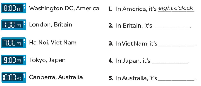 4. In Japan, it’s 9 p.m. (Ở Nhật, bây giờ là 9 giờ tối.)