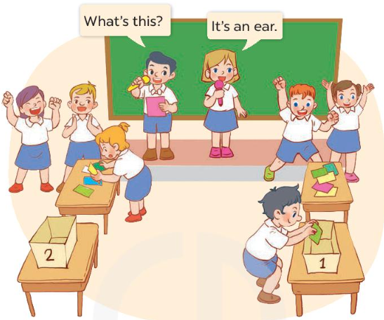 Cách chơi: 2 bạn điều khiển trò chơi, 1 bạn sẽ hỏi và 1 bạn sẽ đưa ra câu trả lời, (ví dụ; “What’s this? It’s an ear.”). Các bạn tham gia chơi sẽ chia làm 2 đội, lần lượt mỗi đội 1 bạn sẽ phải nghe câu hỏi và câu trả lời từ 2 bạn điều khiển trò chơi, tìm mẩu giấy có chứa nội dung được đọc (ví dụ: ví dụ tìm mẩu giấy có “What’s this? It’s an ear.”) , rồi bỏ vào hộp bên đội của mình. Đội nào hoàn thành nhanh hơn đội đó thắng