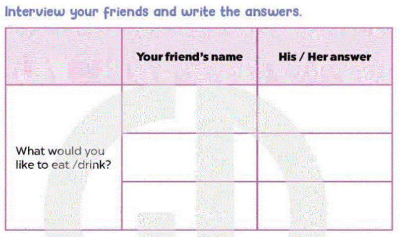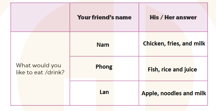 (Phỏng vấn các bạn của bạn và ghi lại câu trả lời.)
