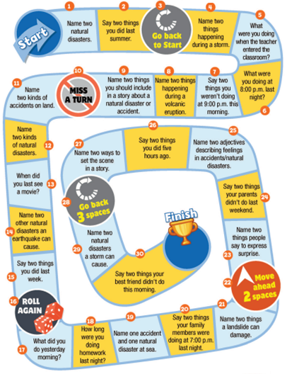 (Chơi trò chơi theo cặp hoặc nhóm nhỏ. Sử dụng cao su làm điểm đánh dấu. Lăn xúc xắc để di chuyển trên bảng. Trả lời đúng hoặc lùi lại một khoảng trắng.)