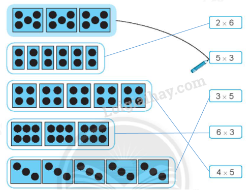 Em đếm số chấm tròn trên mỗi thẻ và số tấm thẻ trong mỗi hình rồi nối với phép nhân tương ứng.