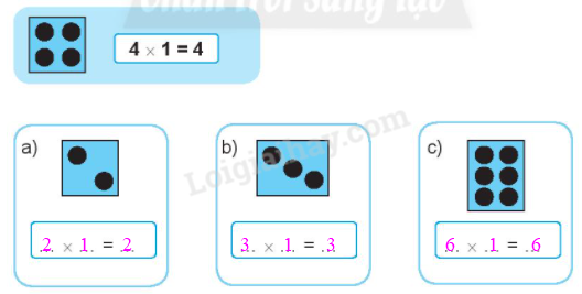 Từ đó em viết kết quả phép nhân vào chỗ chấm.