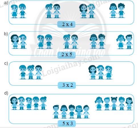 Quan sát tranh, em đếm số bạn học sinh trong mỗi nhóm và số nhóm rồi viết phép nhân thích hợp.