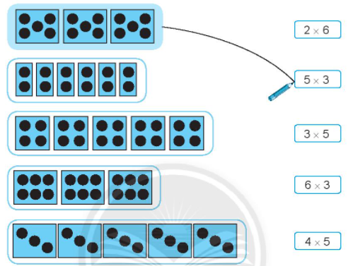 Em đếm số chấm tròn trên mỗi thẻ và số tấm thẻ trong mỗi hình rồi nối với phép nhân tương ứng.