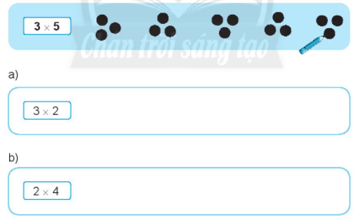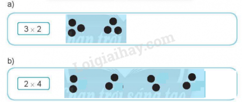 a) Để thể hiện phép nhân 3 x 2, em vẽ 2 nhóm, mỗi nhóm có 3 chấm tròn.