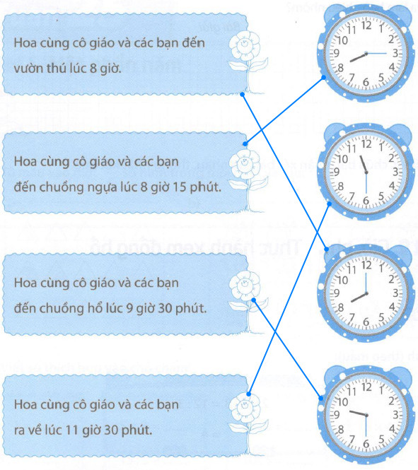 Xem giờ của các đồng hồ bên phải rồi ghép với câu tương ứng.