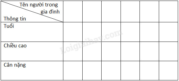 Em hãy thống kê rồi ghi số tuổi, chiều cao, cân nặng của từng người trong gia đình em vào bảng sau :