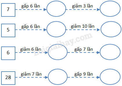 – Lấy số đã cho ở bông hoa đầu tiên thực hiện phép tính nhân hoặc chia với số lần rồi điền kết quả vào chỗ trống.