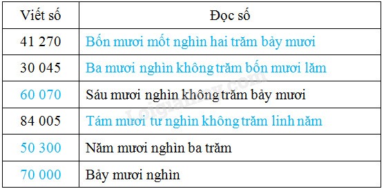 – Đọc lần lượt từ trái sang phải, mỗi chữ số tương ứng với một hàng: Hàng chục nghìn, nghìn, trăm, chục, đơn vị.