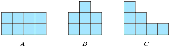 Hình A có 8 ô vuông; hình B có 7 ô vuông và hình C có 7 ô vuông.