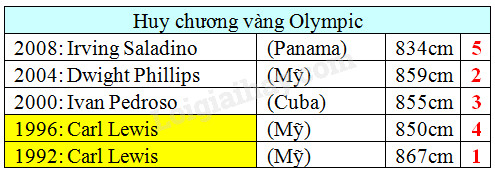Dưới đây là bảng thống kê thành tích của các vận động viên đạt Huy chương Vàng môn nhảy xa tại Đại hội thể thao lớn nhất hành tinh Olympic từ năm 1992 đến 2008. Hãy đánh số lại bảng thành tích này từ cao đến thấp. Tô màu dòng có vận động viên đạt nhiều huy chương vàng nhất. Em hãy tìm hiểu xem hiện nay vận động viên nào đang giữ kỉ lục thế giới về môn nhảy xa.