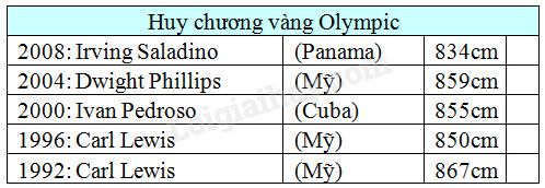 Dưới đây là bảng thống kê thành tích của các vận động viên đạt Huy chương Vàng môn nhảy xa tại Đại hội thể thao lớn nhất hành tinh Olympic từ năm 1992 đến 2008. Hãy đánh số lại bảng thành tích này từ cao đến thấp. Tô màu dòng có vận động viên đạt nhiều huy chương vàng nhất. Em hãy tìm hiểu xem hiện nay vận động viên nào đang giữ kỉ lục thế giới về môn nhảy xa.