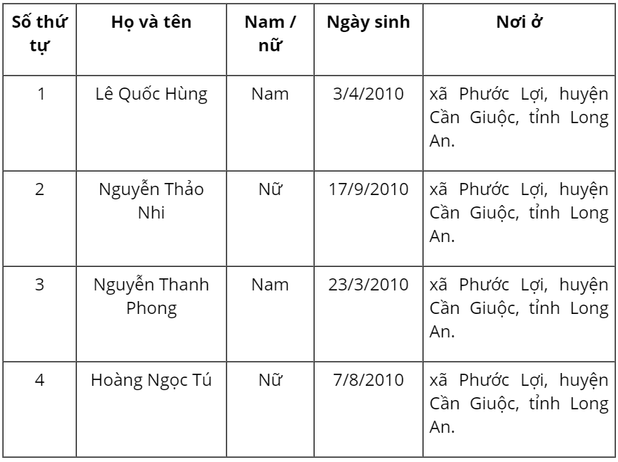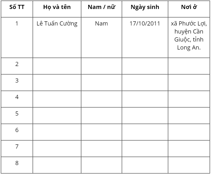 Lập danh sách một nhóm các bạn trong tổ em theo mẫu sau: