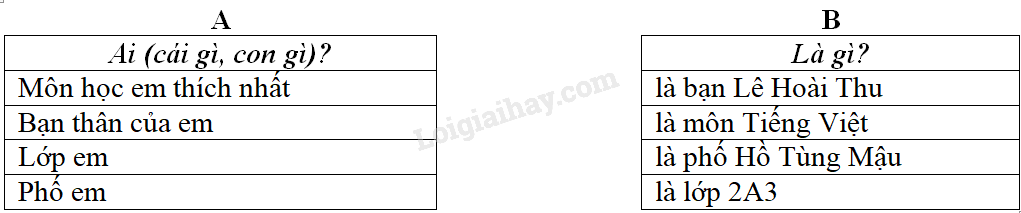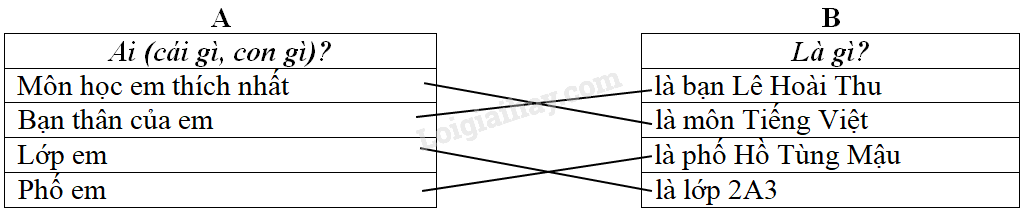 Nối mỗi dòng ở cột A với mỗi dòng ở cột B cho đúng để tạo câu theo mẫu: