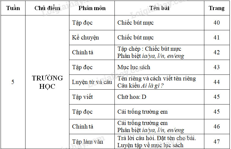 Em hãy dựa vào mục lục sách trong SGK Tiếng Việt 2, tập một viết lại mục lục sách của tuần 5:
