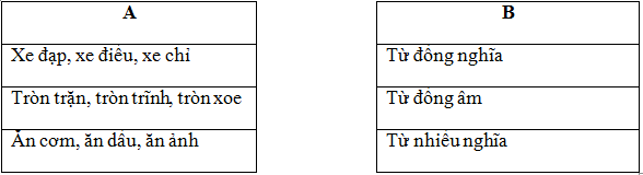 Nối các nhóm từ ngữ ghi ở cột A với từ ngữ chỉ quan hệ của chúng ở cột B cho phù hợp.