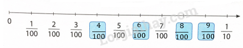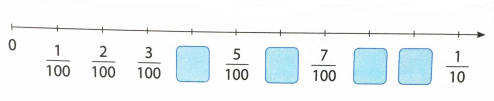 Viết phân số thập phân thích hợp vào ô trống dưới mỗi vạch của tia số: