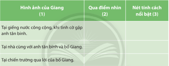 Đặc điểm, tính cách của một nhân vật trong truyện thường được thể hiện qua các hành vi, lời nói của nhân vật ấy trong hoàn cảnh giao tiếp cụ thể, gắn với một hay một số điểm nhìn nhất định (của người kể chuyện, của chính nhân vật hoặc của một nhân vật khác,…). Hãy phân tích tính cách của nhân vật Giang theo gợi ý trong bảng dưới đây (làm vào vở):