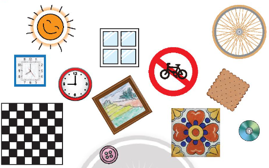 Các hình vẽ có dạng hình tròn là: Mặt trời, cái đồng hồ, cái bánh xe đạp, biển báo giao thông, đĩa nhạc, cái cúc áo.