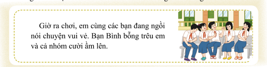 Trong tình huống như vậy, em có thể kiểm soát cảm xúc tốt. Nếu trò đùa của Bình  là đùa vui thì em sẽ vui vẻ, trò chuyện lại với bạn. Nếu trò đùa của Bình có chút nguy hiểm, thay vì tỏ ra khó chịu, tức giận, em sẽ góp ý với bạn để lần sau bạn không trêu đùa như vậy nữa.