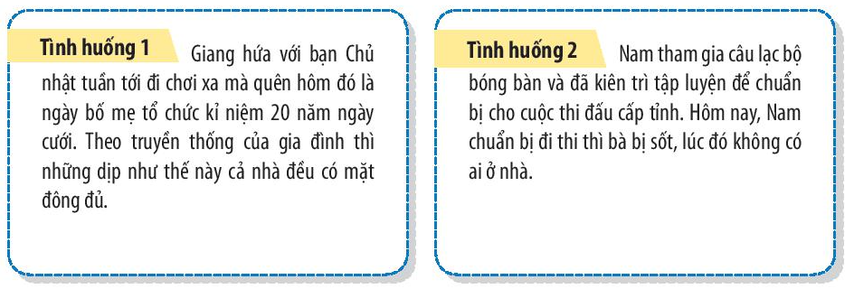Giang nên nói lại với bạn của mình rằng hôm đó đúng vào ngày kỷ niệm 20 năm ngày cưới của bố mẹ. Trong 1 năm chỉ có một lần tổ chức và là dịp các thành viên của gia đình sum họp đông đủ, để chúc mừng cho hạnh phúc của bố mẹ, của gia đình. Giang và bạn có thể lùi kế hoạch đi chơi xa vào sau tuần đó hoăc mộ dịp thích hợp hơn.
