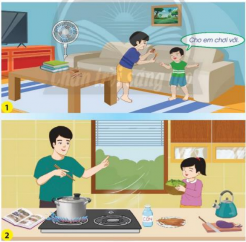 – Hình 2: Các vật liệu dễ cháy (quyển sách, lọ cồn) được để gần bếp ga, gió từ ngoài thổi vào bếp ga đang đun nấu có thể gây ra cháy nhà.