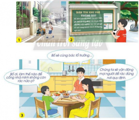 Quan sát các hình sau và kể lại câu chuyện của bạn Nam. Nam đã nói với bố mẹ điều gì? Vì sao? Gia đình Nam sẽ làm gì để giữ vệ sinh xung quanh nhà.