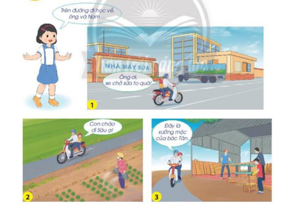 – Kể chuyện theo các hình: Trên đường đi học về, ông và Nam đã đi qua các khu có hoạt động sản xuất. Đầu tiên ông và Nam đi qua nhà máy sữa, sau đó là vườn rau nhà dì Sáu và cuối cùng là xưởng mộc của bác Tân.