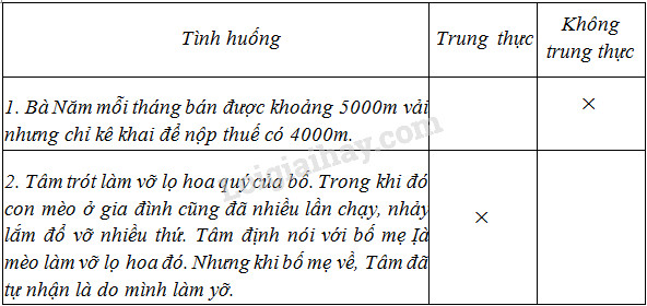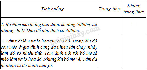 Tình huống nào sau đây thể hiện sự trung thực hoặc không trung thực ? Hãy ghi vào vở !