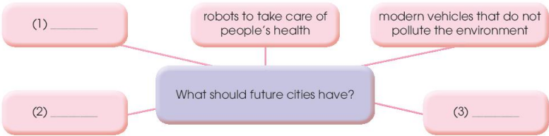 (Làm việc theo cặp. Thảo luận xem các thành phố trong tương lai nên có những gì để cư dân thành phố có thể sống lâu và khỏe mạnh. Điền vào sơ đồ.)