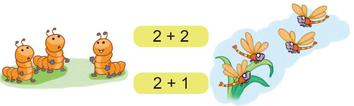 – Có 2 con chuồn chuồn đang đậu trên lá cây và thêm 2 con chuồn chuồn đang bay tới nên phép tính thích hợp là: 2 + 2 = 4