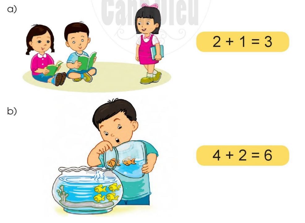 b) Có 4 con cá đang bơi trong bể cá. Bạn Nam mua thêm 2 con cá thả vào bể. Trong bể bây giờ có 6 con cá.
