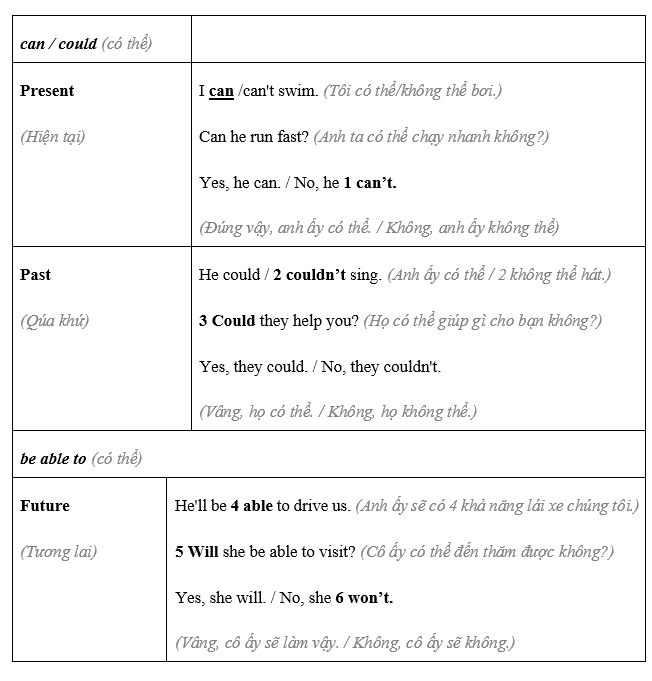 (Viết câu và câu hỏi sử dụng dạng đúng của can, could hoặc be able to.)