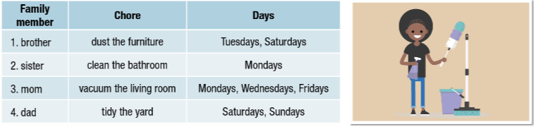 b. Now, listen and write in the name of the family member that does the chore and how often they do it.