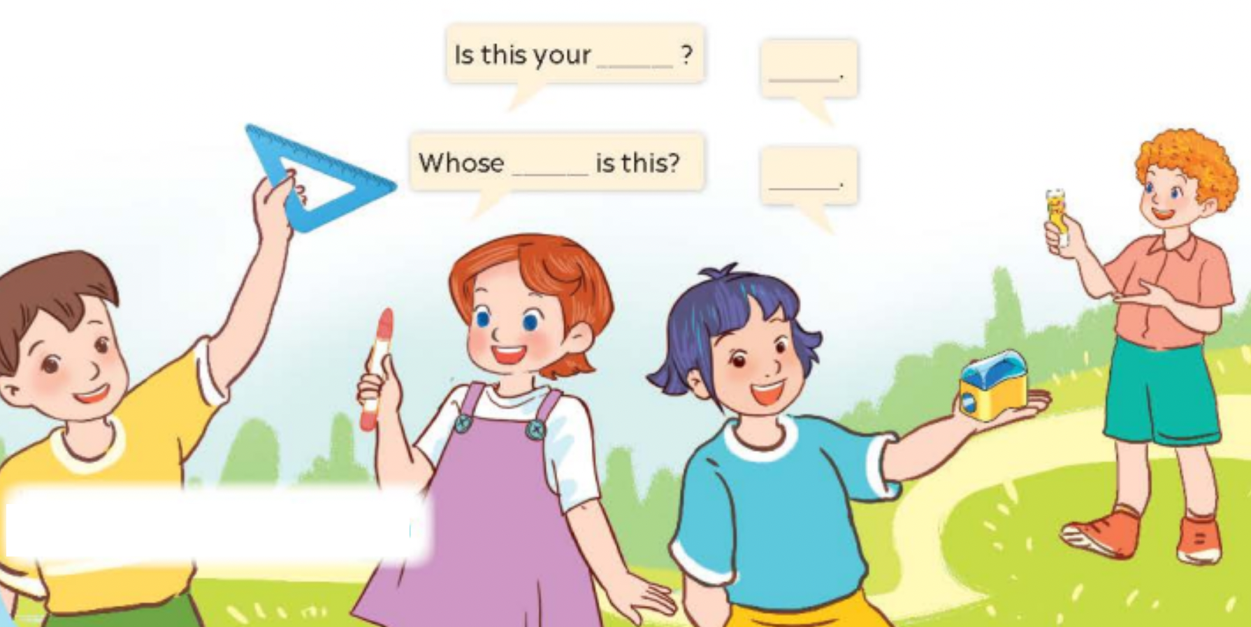 Với mỗi đồ dùng học tập, sử dụng cấu trúc hỏi và trả lời đã học trong bài này, hỏi xem ai là chủ nhân của đồ vật đó.