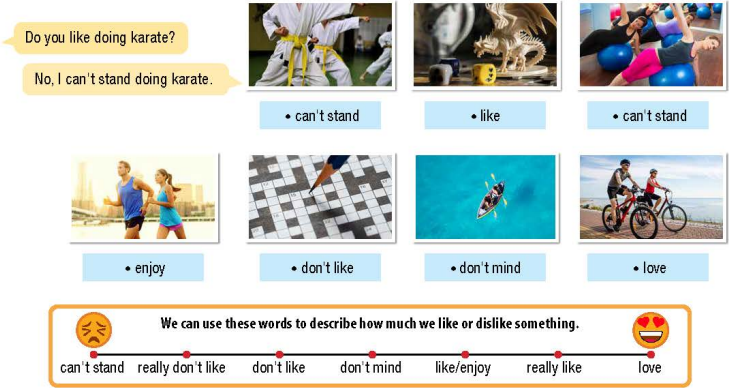 can’t stand (cực kỳ không thích) -> really don’t like (rất không thích) -> don’t like (không thích) -> don’t mind (không ngại) -> like/enjoy (thích thú) -> really like (rất thích) -> love (yêu thích)