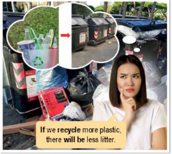 (Nếu chúng ta đặt các thùng rác tái chế xung quanh trường học của chúng ta, chúng ta sẽ giảm bớt rác.)