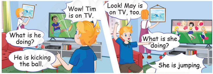 Look! May is on TV, too. (Nhìn kìa! May đang ở trên ti vi.)