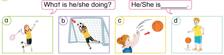 He is / She is + V-ing (động từ thêm ing). (Anh ấy / Cô ấy đang ___.)