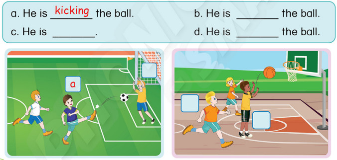 He is kicking the ball. (Cậu ấy đang đá bóng.)