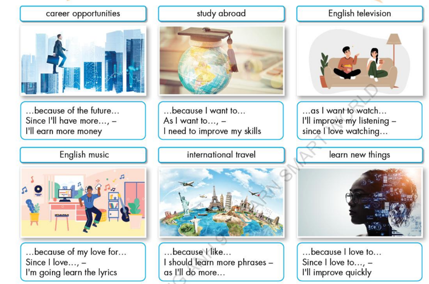 B: I’m learning English because of future career opportunities. Since I’ll have more career opportunities, I’ll earn more money.