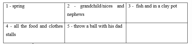 Ông: Bố mẹ ông và ông sẽ đi dạo quanh chợ và xem tất cả các quầy hàng thực phẩm và quần áo.