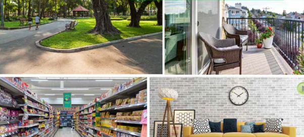 (Những hình ảnh mô tả một số yếu tố chính thường gắn liền với ngôi nhà và khu vực lân cận: công viên, khu dân cư, cửa hàng bách hóa và phòng ngủ.)