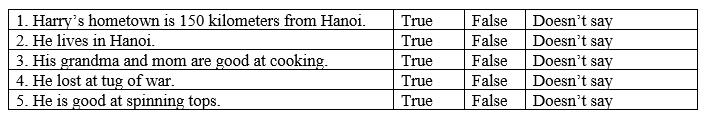 1. Harry’s hometown is 150 kilometers from Hanoi. => True