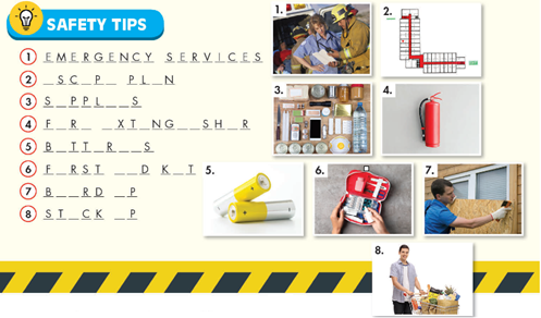 a. Complete the words with the vowels (a, e, i, o, u). b. Fill in the blanks using the words from Task a. a. Listen to someone talking to students about disasters. Who is the man? b. Now, listen and circle. Draw lines to match the prepositions of place and movement to the pictures. Write one thing people should / shouldn’t do to prepare for and one thing people should / shouldn’t do during three different disasters. Use prepositions of place and movement.