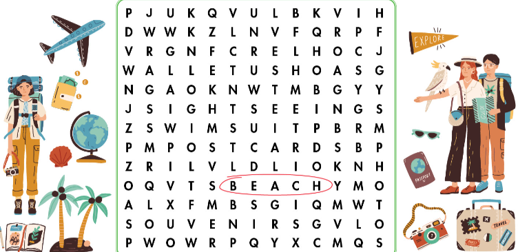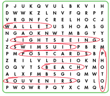 New words: a. Unscramble the words. b. Find the words from Task a in the word search. c. Fill in the blanks with the words from task a. Listening: a. Listen to Emily talking about her trip to Sydney.Tick(✔) the places she visited.b. Now listen again and write True or False. Grammar: Fill in the blanks with the Past Simple form of the verbs. Writing: Answer the questions